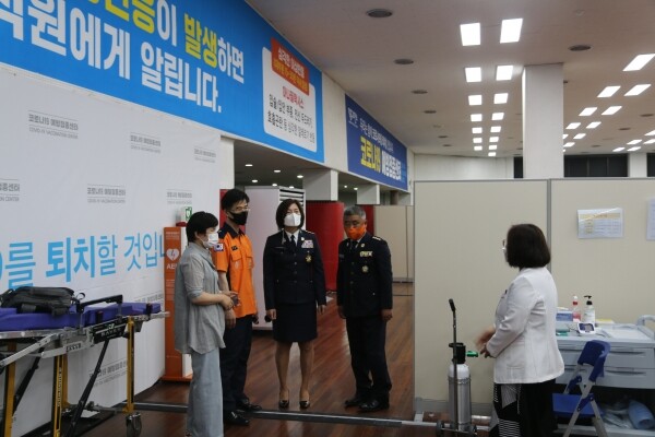 예방접종센터에는 각각 구급차량 1대, 구급대원 3명, 의용소방대원 5명이 지원되어 접종 중 응급환자 발생 시 응급처치 및 긴급이송, 센터 내 질서 유지 등 업무에 임하고 있다.