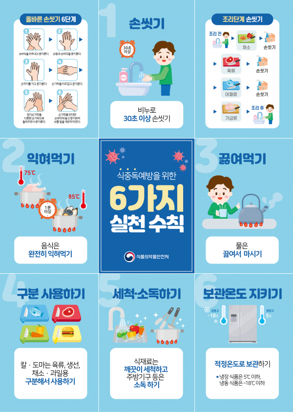 식약처는 식중독 예방 6대 수칙인 손씻기, 익혀먹기, 끓여먹기, 칼·도마 구분 사용하기, 세척·소독하기, 보관온도 지키기 실천을 강조하면서 특히 대량으로 음식을 조리하는 급식소 등에서는 식재료의 세척, 보관, 조리에 각별히 주의하고 설사 등 식중독 의심 증세가 있는 조리종사자는 증상이 없어진 후에도 최소 2~3일까지는 조리하지 않도록 당부했다.
