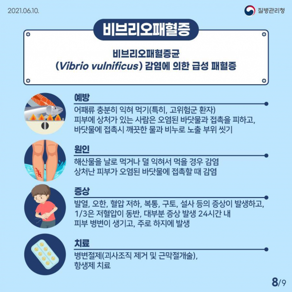 질병관리청 정은경 청장은 “비브리오패혈증을 예방하기 위해 어패류, 게, 새우 등 날 것 섭취를 피하고 어패류 조리, 섭취 시 비브리오패혈증 예방수칙을 준수하도록 당부”했다.