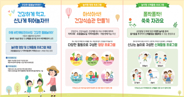 건강한 돌봄놀이터 사업은 학기 단위로 운영되며 영양·식생활 체험 교육 프로그램 24차시, 놀이형 신체활동 프로그램 48차시, 비만도 및 건강습관 평가 등으로 구성된다.