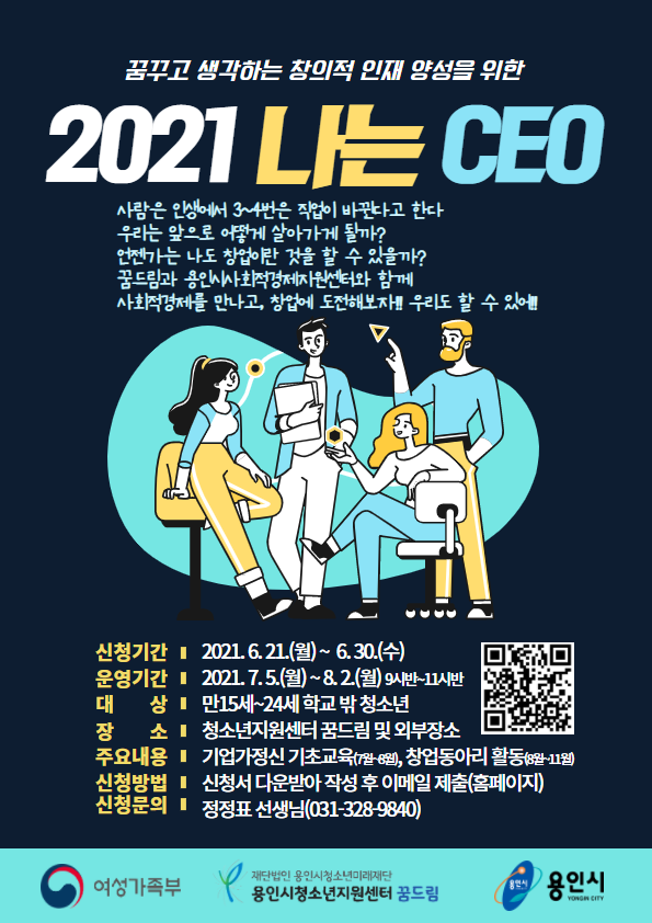 용인시청소년지원센터 꿈드림과 용인시사회적경제지원센터는 지난 4월 5일 지역 내 학교 밖 청소년들의 건강한 성장과 직업체험 및 자립의 기회를 제공하기 위해 업무협약을 체결했고 학교 밖 청소년 창업을 지원하기 위해 ‘나는 CEO’를 함께 기획·운영하고 있다.