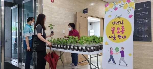 앞서 동은 지난달 젊음의 광장에 봉선화와 백일홍 등의 꽃씨를 뿌렸고 이날 잘 자란 꽃모종 100개를 작은 컵에 옮겨 담아 1인당 1개씩 지급했다.