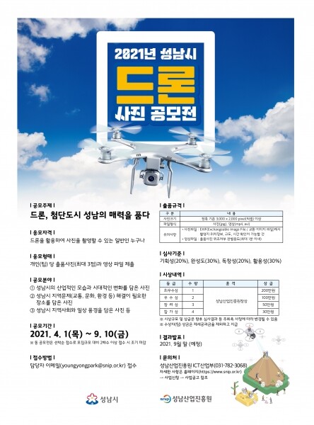 한편 성남산업진흥원은 2020년에 ‘성남시 드론 홍보영상 아이디어 공모전’을 진행해 기업 5개사, 일반인 6명의 수상자를 선정하고 수상작 16개 영상은 일반인들이 언제든지 볼 수 있도록 진흥원 공식 SNS 페이지와 성남시청, 구청 등을 통해 온, 오프라인 홍보를 진행한 바 있어 올해도 드론산업 저변 확대와 드론 레저문화 활성화 차원에서 ‘드론 사진 공모전’을 기획하게 됐다.