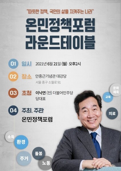온민정책포럼은 이같은 정책연대 선언의 일환으로 21일 서울 중구 안중근의사기념관에서 이낙연 전 대표를 초청해 ‘따뜻한 정책, 국민의 삶을 지켜주는 나라’를 주제로 라운드테이블을 개최한다.