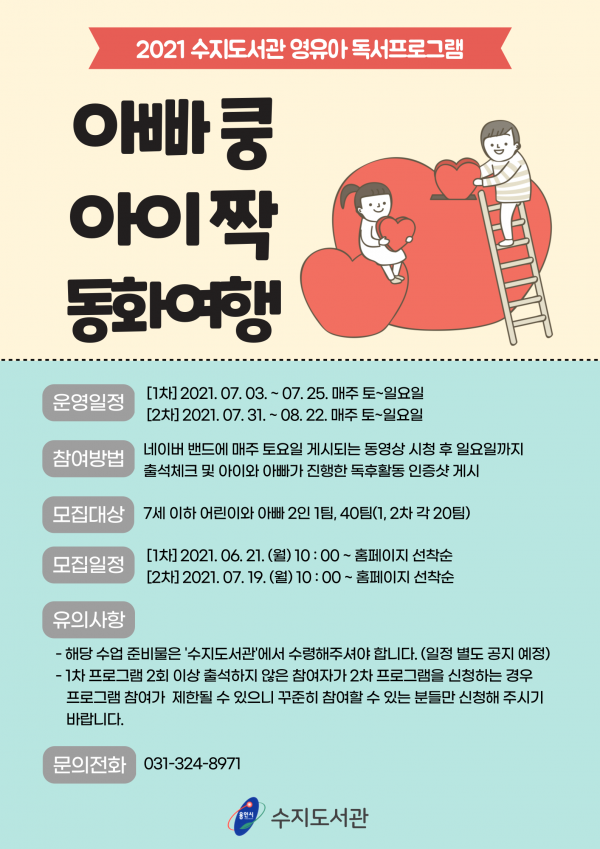 7세 이하 유아와 아빠 2인 1팀으로 각 20팀씩 참여할 수 있으며 1차 참가자는 오는 21일부터, 2차 참가자는 다음달 19일부터 수지도서관 홈페이지에서 선착순으로 모집한다.