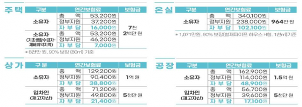 보험가입자가 부담하는 연간보험료는 가입 지역 및 면적, 보상한도 등에 따라 차이는 있으나, 정부와 지자체의 지원을 통해 비교적 저렴한 비용으로 풍수해보험에 가입할 수 있다.
