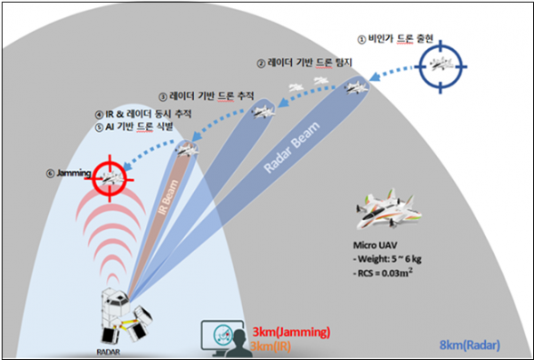 비록 신생 창업기업이지만 초소형 드론 탐지 레이더 분야에서 세계적 수준의 기술을 보유하고 있고 이를 체계업체가 전파방해 시스템과 통합?연동해 새로운 드론 대응 체계를 구성한 것이다.