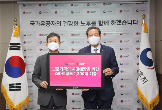 기증식은 ’국가유공자의 노후를 함께 한다‘라는 표어로 황기철 국가보훈처장, 황현식 엘지유플러스 대표가 참석한 가운데, 21일 오후 3시 서울지방보훈청에서 진행했다.