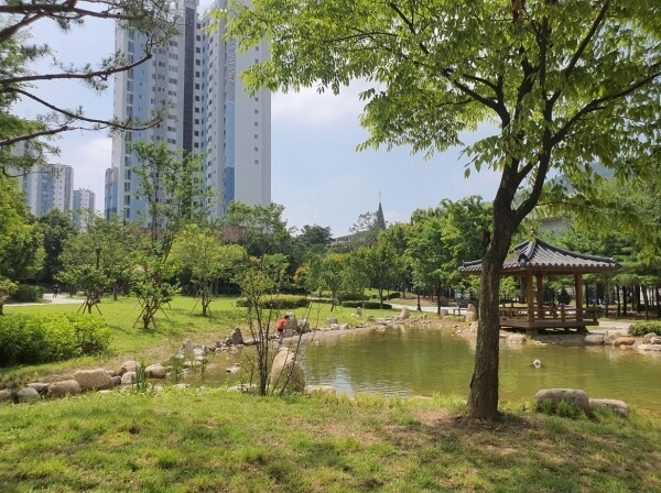 공원에는 산책 후 쉴 수 있는 정자와 피크닉용 테이블을 설치하고 생태습지를 정비해 잔디마당과 광장을 조성했다.