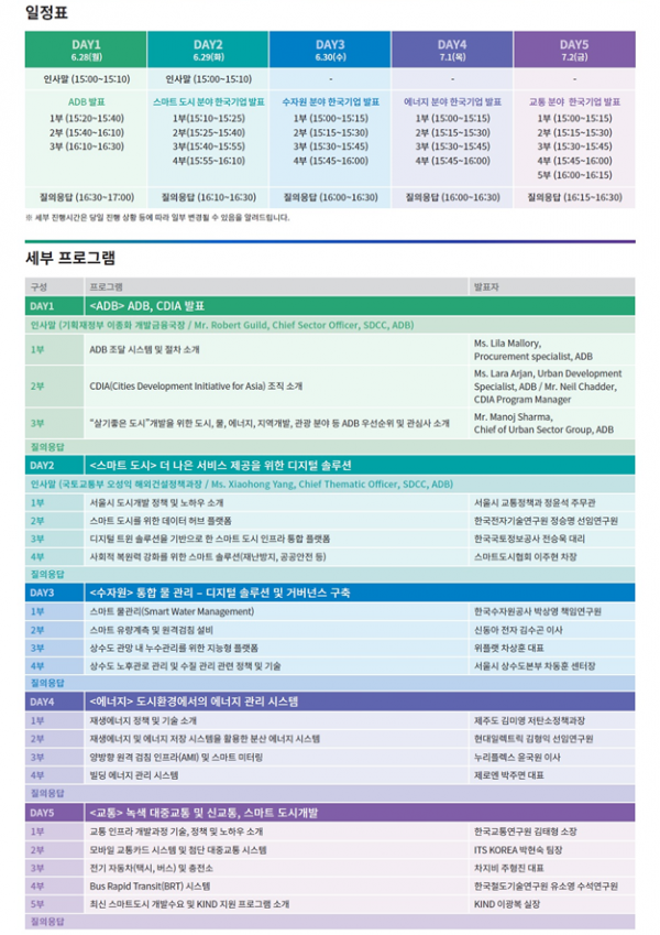 2~5일차에는 우리 기업 및 기관들이 디지털솔루션, 수자원, 에너지, 교통 등 유망분야에 대한 한국의 스마트 기술 및 개발 정책 등을 소개하고 ADB 사업으로 연계할 수 있는 실행방안을 ADB측과 논의할 계획이라고 전했다.