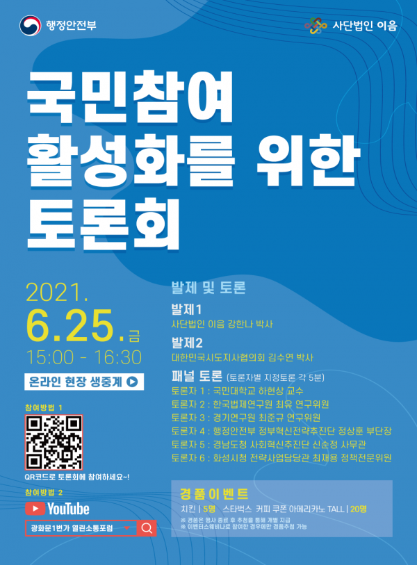 사단법인 이음의 강한나 책임연구원이 ‘국민참여 제도·사업의 성과와 시사점’이라는 주제로 대한민국 시도지사협의회 김수연 제도분권부장이 ‘국민참여활성화를 위한 제도적 기반 마련의 필요성과 기대효과’라는 주제로 발제하며 전문가들과 지방자치단체 참여활성화 업무 담당자가 현장 토론자로 참여한다.