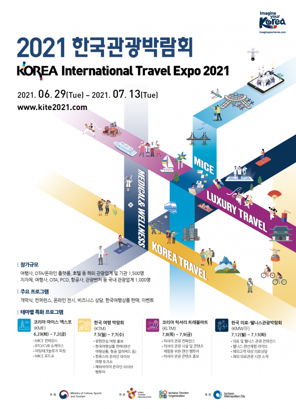 오는 29일 인천 영종도 파라다이스시티에서 열리는 개막식을 시작으로 마이스, 한국여행, 럭셔리, 의료웰니스 관광박람회가 순차적으로 개최되며 박람회 기간 중 국내 지자체·여행사·항공사·숙박업체·의료기관 등 1천개 사가 온라인 전시홍보관에 참가한다.