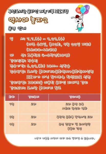 화상회의 앱인 줌으로 진행되는 이번 역사 강좌는 시민 재능기부 프로그램의 일환으로 마련됐으며 처인구 모현읍 주민인 장수진 역사논술 지도사가 강사로 참여한다.