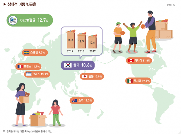 2019년 아동의 상대적 빈곤율은 10.6%로 전년대비 1.7%p 감소했고 OECD 평균과 비교해 상대적으로 낮게 나타나 아동의 빈곤 상황이 지속적으로 해소되고 있다.