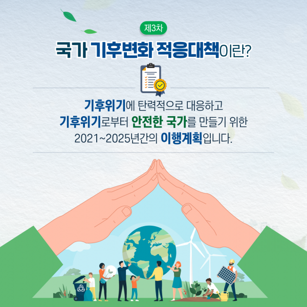 환경부 등 관계부처 합동으로 수립된 ‘제3차 국가 기후변화 적응대책’은 지난해 12월 14일에 열린 제45차 녹색성장위원회에서 심의·확정됐으며 기후변화 적응을 이행하기 위한 5년간의 방향, 목표, 이행과제를 제시하는 최상위대책이다.