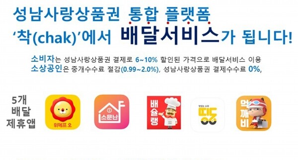 시는 착 배달서비스 확산을 위해 오는 8월 2일부터 예산 소진 때까지 5개 민간 배달앱에서 주문 뒤 모바일 성남사랑상품권으로 결제하는 고객에 5000원권의 모바일 할인 쿠폰을 제공하는 이벤트를 연다.