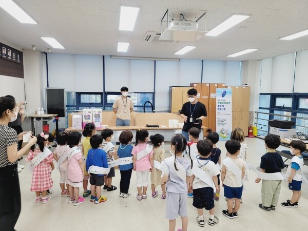 관내 샛별유치원 원아 100여명이 참여한 이번 환경교육은 환경보존의 소중함을 알려주기 위해 마련, 어린이들이 모아온 우유, 두유 등 종이팩을 휴지와 종량제봉투로 교환하는 방식으로 진행했다.