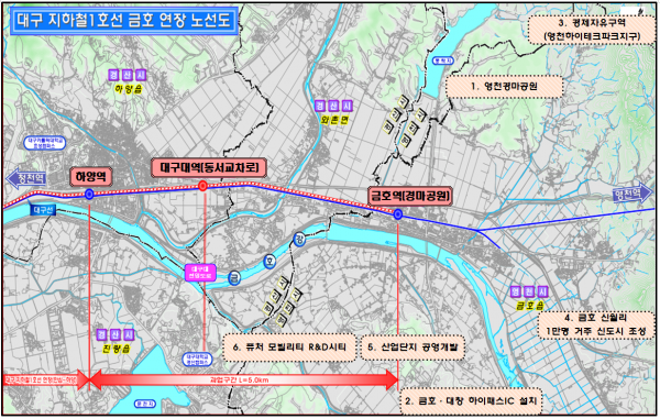 국토부가 발표한 제4차 국가철도망 구축계획에 따르면 비수도권 지역 광역철도 확대 사업으로 총 11개의 신규 사업이 반영됐으며 대구1호선 영천 연장 노선은 총사업비 2,052억원 규모로 경산 하양역과 영천 금호 간 5km를 복선으로 구축할 계획인 것으로 나타났다.