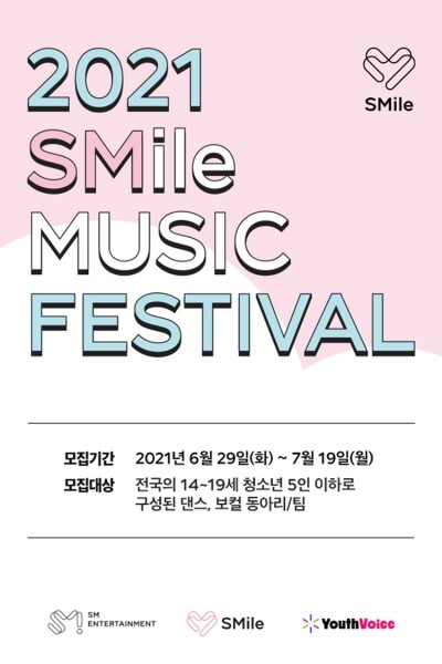 이번 ‘SMile Music Festival’은 전국 14~19세 청소년 중 학교, 기관, 단체에 소속되어 5개월 이상 활동한 경험이 있는 5인 이하 댄스 및 보컬 팀을 대상으로 7월 19일까지 이메일을 통해 참가 신청을 받으며 자세한 사항은 SMTOWN 공식 홈페이지 및 ‘SMile Music Festival’ 공식 홈페이지에서 확인 가능하다.