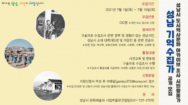 참여 자격은 구술자료 수집 관련 경험·경력이 있는 성남시민, 지역 소재 대학이나 직장을 다니는 역사학, 문화인류학 등 관련 전공자다.