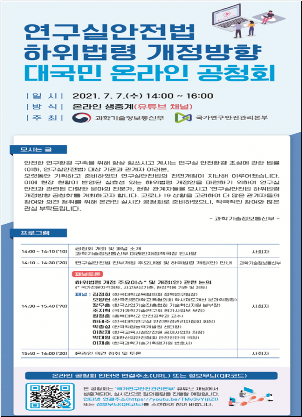 이 날 공청회는 한국대학교육협의회, 한국전문대학교육협의회, 국가과학기술연구회, 한국산업기술진흥협회, 전국대학 연구실안전환경관리자 협의회 등 관련 토론자 10명이 참석한 가운데 코로나19 상황을 고려해 온라인 실시간 생중계 방식으로 진행된다.