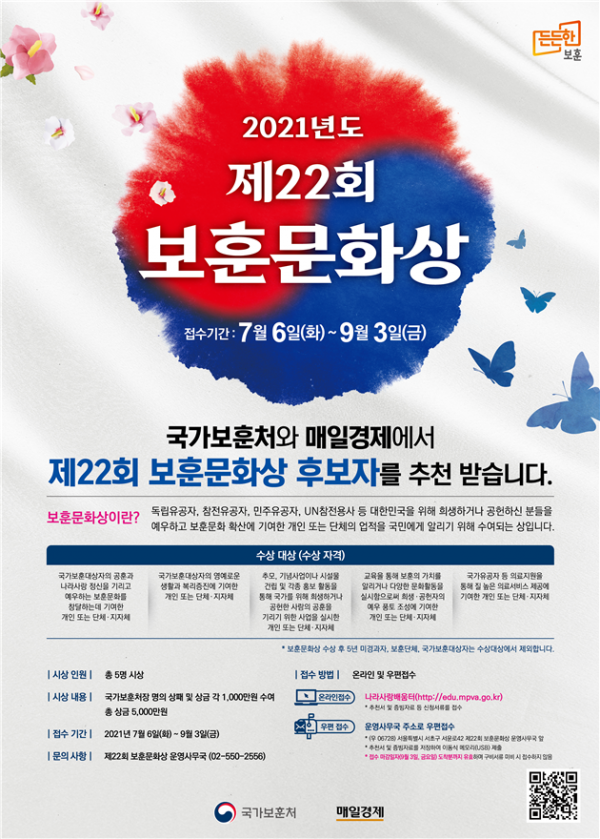 자세한 사항은 ‘나라사랑배움터’ 누리집 또는 보훈문화상 운영사무국으로 문의하면 된다.