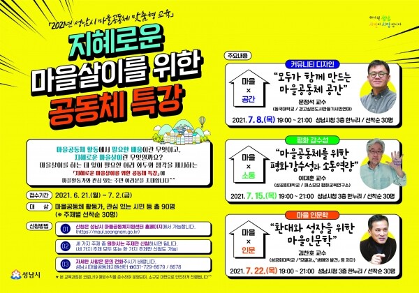 이번 특강은 마을공동체 활동에 관심 있는 시민에게 체계적인 맞춤형 교육을 지원하기 위해 마련돼 공간, 소통, 인문 등 3개 주제로 꾸며진다.