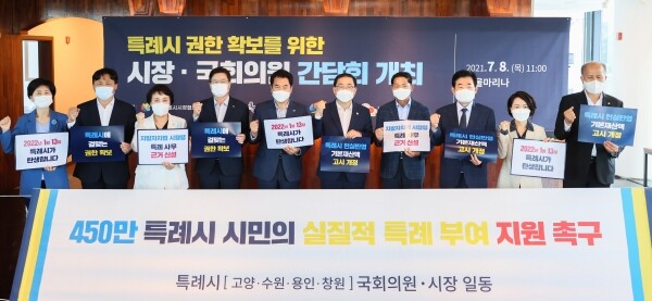 백군기 용인시장, 이재준 고양시장, 염태영 수원시장, 허성무 창원시장과 정춘숙·김영진·백혜련·한준호·최형두 의원 등은 이날 서울 마리나컨벤션센터에서 간담회를 갖고 실질적인 특례 부여를 위해 정부 지원을 촉구하는 내용의 공동성명문를 발표했다.
