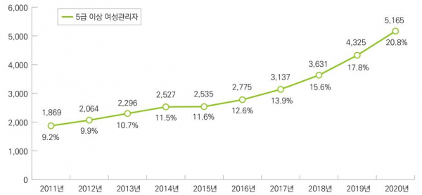 여성관리자 수는 2011년 1,869명에서 꾸준히 증가해 ‘20년 5,165명으로 10년 만에 약 2.7배 증가했다.