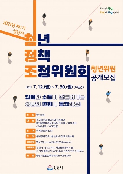 성남시 청년정책과장은 “청년정책조정위원회는 민간 부분의 전문가와 청년이 중심 역할을 해 청년정책의 전문성과 체감도를 동시에 높이게 될 것”이며 “활동 경험이 풍부한 청년들의 많은 관심과 참여를 바란다”고 말했다.