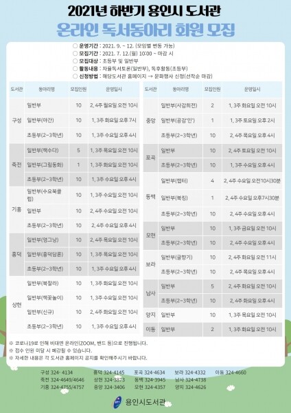 올해는 구성 · 죽전 · 기흥 · 흥덕 · 상현·중앙 · 포곡 · 동백 · 모현 · 보라 · 남사 · 양지해밀 · 이동꿈틀 등 총 13곳의 도서관에서 활동할 독서동아리 회원 일반부 151명, 초등부 110명 등 총 261명을 모집한다.
