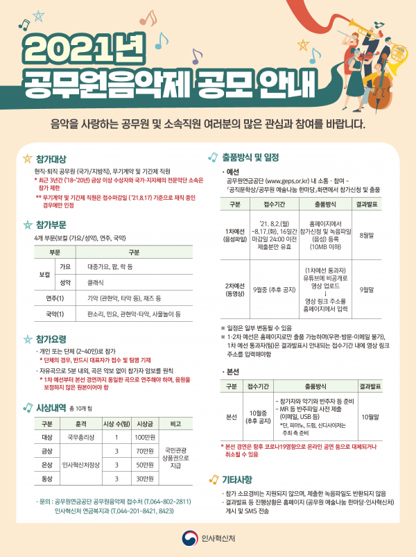 인사혁신처는 가요, 성악, 연주, 국악 등 총 4개 부문에 대한 공무원 음악제 출품 작품을 8월 2일부터 17일까지 공개모집한다고 12일 밝혔다.