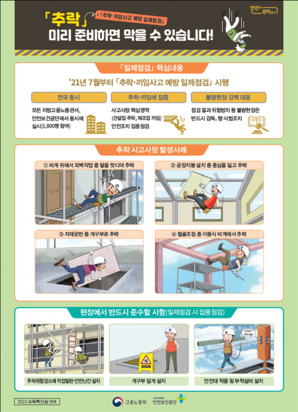 이와 함께, 추락사고 예방을 위한 자율점검표와 안전수칙을 배포해 사업장에서 쉽게 안전조치를 할 수 있도록 지도하고 현장 관계자와 근로자의 자율적인 안전조치 노력을 당부한다.