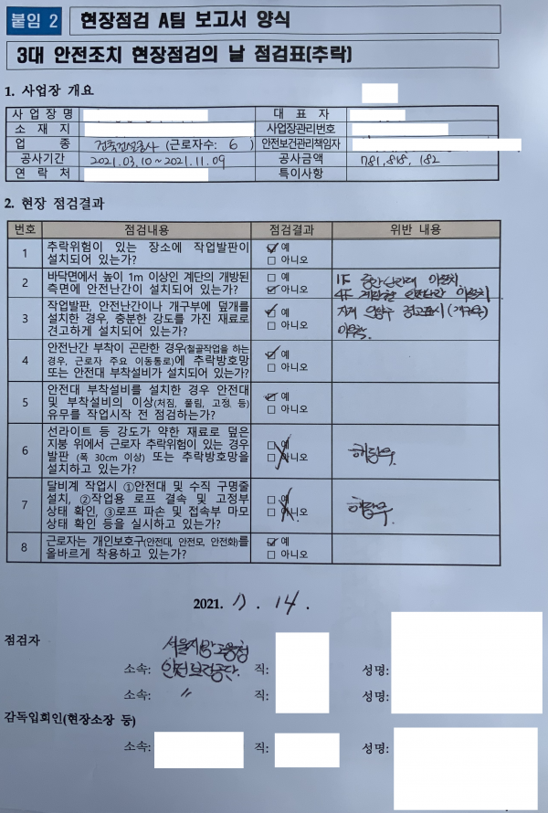 이에 박화진 고용노동부 차관과 현장점검팀은 해당 작업 장소에 계단 옆 안전난간 및 중간 안전난간 미설치, 개구부 덮개 미표시 등 안전조치 미비 사항을 확인해 시정을 요구하는 한편 건설현장 스스로 추락 사고를 예방조치를 할 수 있도록 안전수칙과 자율점검표도 전달하며 자율적인 안전조치 이행을 당부했다.