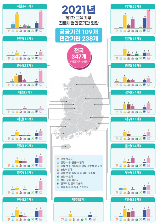 교육기부 진로체험기관 인증제는 ‘진로교육법’에 근거해 학생에게 무료로 양질의 진로체험 기회를 제공하는 진로체험 기관을 발굴·관리하기 위한 제도로 이번 1차 선정된 기관을 포함해 총 2,158개의 인증기관을 선정·운영 중이다.