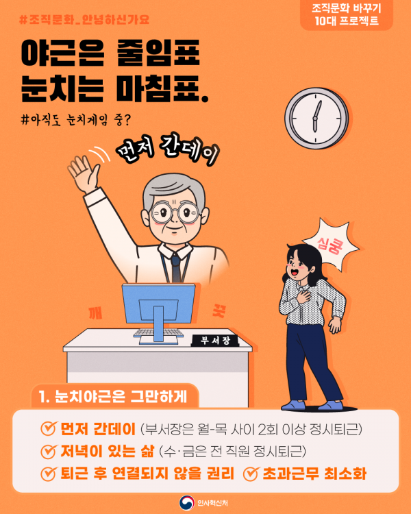 인사처는 7월 중 중점 과제로 ‘눈치야근은 그만하게’와 ‘휴가는 자유롭게’를 선정해 실천하고 내·외부 홍보도 진행한다.