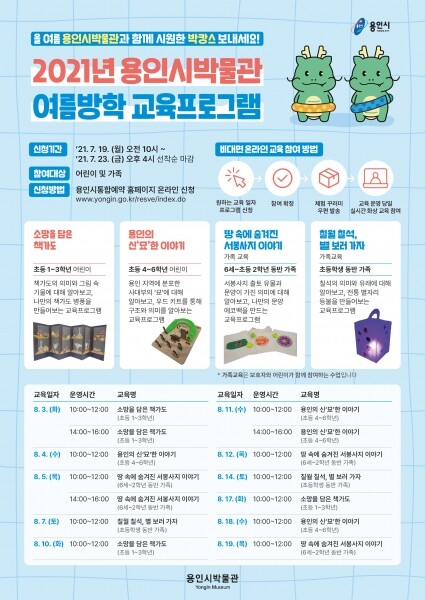 프로그램은 박물관 소장유물인 책가도와 연계한 ‘소망을 담은 책가도’를 비롯해 기획전시와 연계해 용인 지역 사대부 묘에 대해 알아보는 ‘용인의 신묘한 이야기’, 서봉사지 출토 유물과 연계한 ‘땅속에 숨겨진 서봉사지 이야기’, 세시풍속 중 하나인 칠석과 연계한 가족 교육프로그램 ‘칠월 칠석, 별 보러 가자’ 등 어린이와 온 가족이 함께 참여할 수 있도록 구성됐다.