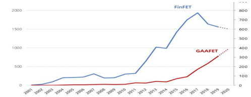 특허청이 주요 5개국 특허를 분석한 결과 그동안 반도체 미세화 공정기술의 주력이었던 핀펫 기술 특허가 지난 2017년부터 하락세로 전환됐고 게이트올어라운드 기술 특허가 증가세를 보이고 있는 것으로 나타났다.