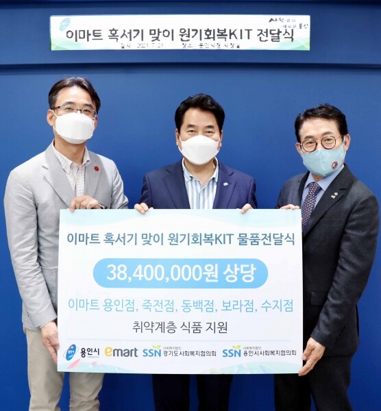 이날 용인시청에서 열린 ‘이마트 혹서기 맞이 원기회복KIT 물품전달식'에는 백군기 용인시장을 비롯해 박종욱 이마트 동백점 점장, 정성규 용인시사회복지협의회장 등이 참석했다.