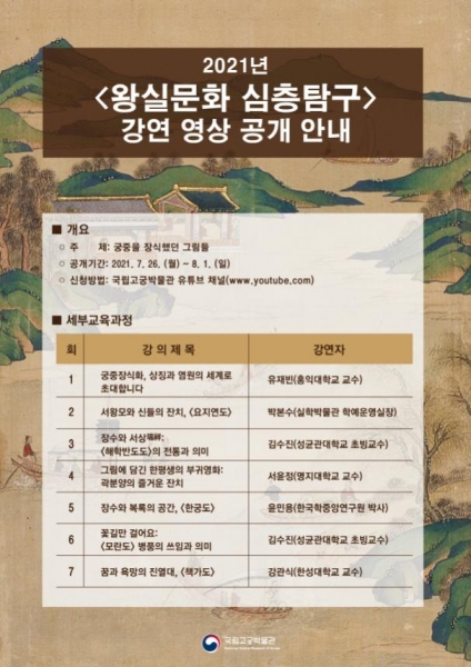 ‘왕실문화 심층탐구’는 일반인들이 왕실문화에 대해 깊이 이해할 수 있도록 개설한 교육 프로그램으로 올해는 6월부터 7월까지 ‘궁중장식화’를 주제로 총 7회의 강좌가 운영된 바 있다.