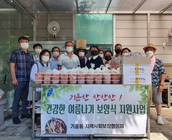 기흥동 지역사회보장협의체 위원들은 지난 21일 중복을 맞아 준비한 30인분의 삼계탕과 밑반찬, 떡 등이 담긴 꾸러미를 저소득 홀로 어르신 30가구에 비대면 방식으로 전달했다.