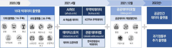 과기정통부는 ’19년부터 분야별 데이터의 수집·가공·분석·유통을 위한 빅데이터 플랫폼을 구축·운영하고 있으며 ’20년 3월에는 통합 데이터지도 서비스를 개시해 빅데이터 플랫폼의 통합적인 검색·활용을 지원하고 있다.