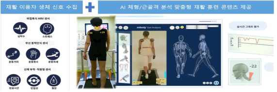 손바닥만한 크기의 비접촉식 레이더센서와 동작인식 센서가 재활환자의 심박, 호흡, 움직임, 자세 등 생체 데이터를 수집하고 인공지능이 환자가 필요한 재활운동의 종류, 시간 강도 등을 계산해 맞춤형 가상현실.증강현실 재활콘텐츠를 추천한다.