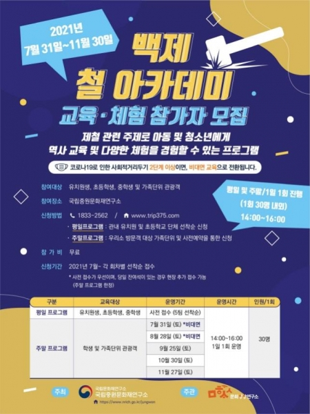 ? ‘백제 철 아카데미’ 교육·체험활동을 희망하시는 분은 인터넷, 카카오 스토리, 전화로 신청하면 된다.