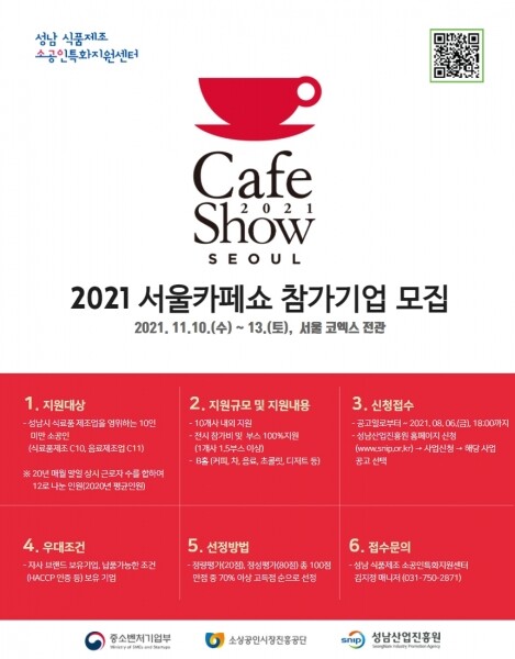 특히 이번 서울카페쇼는 20주년을 맞이해 풍성한 이벤트 및 다양한 행사를 진행한다 본 사업은 2014년도부터 중소벤처기업부가 추진하는 국책사업으로 성남 식품제조 소공인특화지원센터가 관내 식품 기업들의 마케팅 활성화를 위해 운영하고 있다.