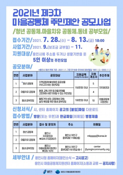 공모는 청년 활동 지원을 위한 청년 공동체 5개팀 마을 문제 해결을 위한 마을치유 공동체 4개팀 마을에 대해 함께 공부하는 동네 공부모임 10개팀 등 총 3가지 분야에 19팀을 모집하고 용인에 주소를 두거나 직장이나 학교 등 생활기반을 둔 5인 이상의 모임이면 각 분야에 맞는 사업을 자유롭게 제안하면 된다.