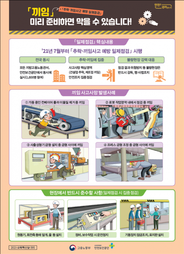 특히 이번 점검에는 고용노동부 장관도 직접 나서서 사업장의 끼임 위험요인을 점검하고 사업주 등 현장 관계자 및 근로자에게 적극적 안전조치 노력을 당부할 계획이라고 전했다.