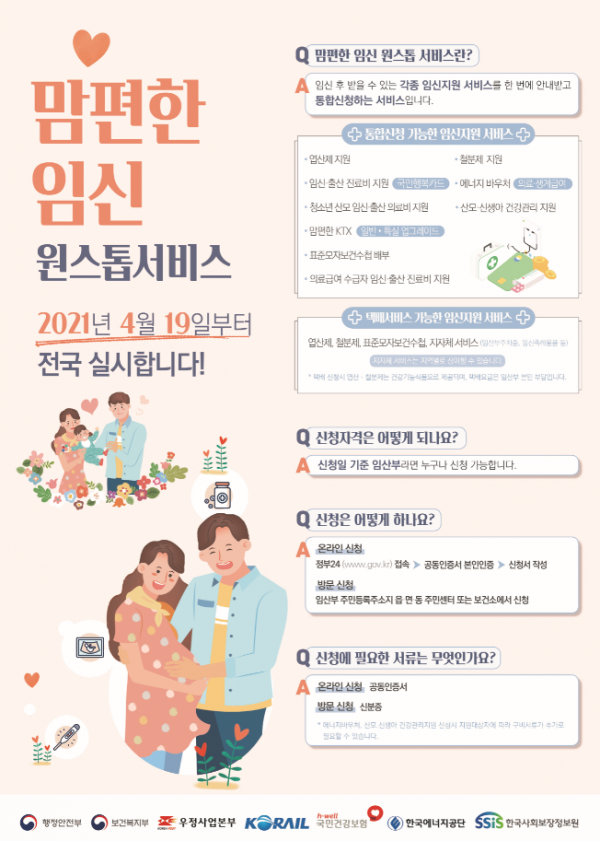 ‘맘편한 임신’ 원스톱 서비스는 임신·출산 진료비 지원, 엽산·철분제 제공, KTX 요금 할인신청 등 임산부에게 제공되는 여러 서비스를 ‘정부24’ 또는 주민센터·보건소에서 한 번에 안내받고 신청하는 서비스로 지난 4월 19일부터 전국에서 시행됐다.