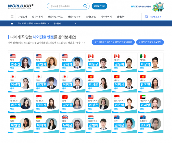 ‘해외취업 K-MOVE 멘토단’은 해외취업 경험이 있는 선배들이 해외 진출을 희망하는 청년들에게 생생한 노하우를 제공하기 위해 2013년에 시작된 프로그램으로 코로나19로 인해 2020년부터 월드잡플러스에서 온라인으로 멘토링을 제공하고 있다.