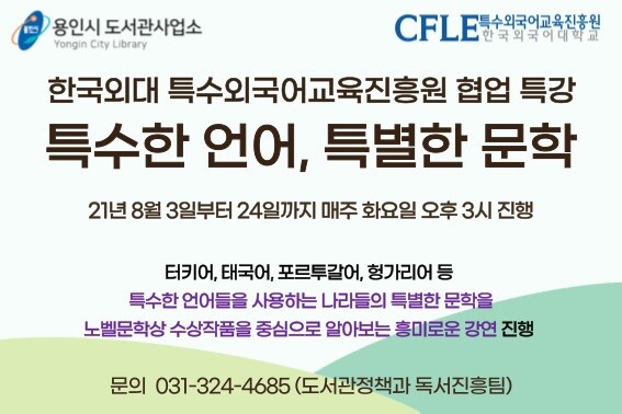 시 도서관 관계자는 “관내 대학인 한국외대 특수외국어교육진흥원과 협업해 평소에 쉽게 만나볼 수 없었던 특별한 온라인 강연을 기획했다”며 “다양한 외국어에 대해 시민들이 깊이 있게 알아볼 수 있는 좋은 기회가 되길 바란다”고 말했다.